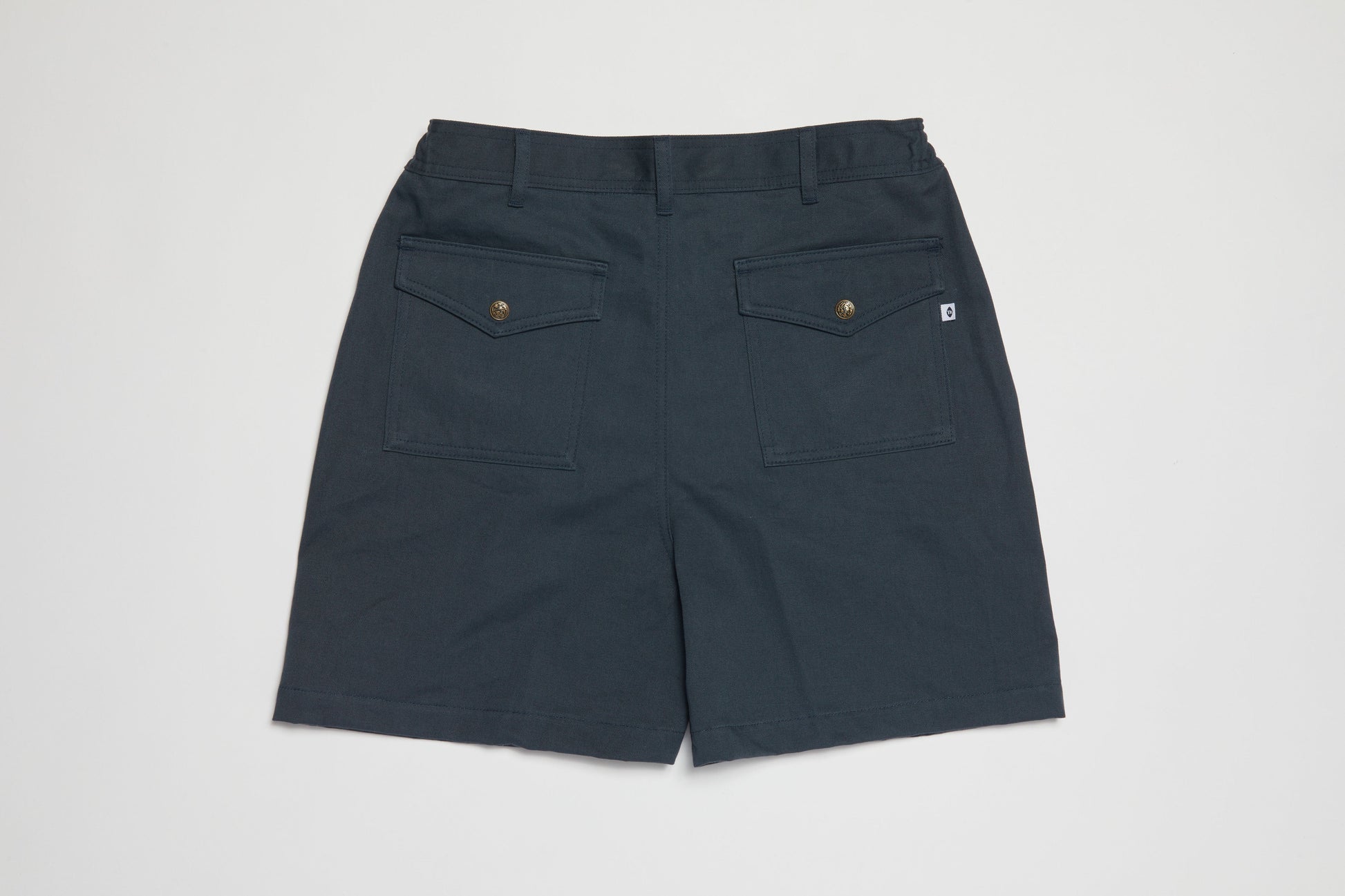 We've modified our favorite boy scout shorts for more functionality. The fabric is 100% cotton twill, and the width of the flapped pockets on the hips has been widened to make it easier to put in and take out the wallet. The waistband has a unique construction, and both side are featuring elastic, making it comfortable to wear. An outline like a culottes skirt will stand out in current trend. Pre-washed, does not shrink after washing.