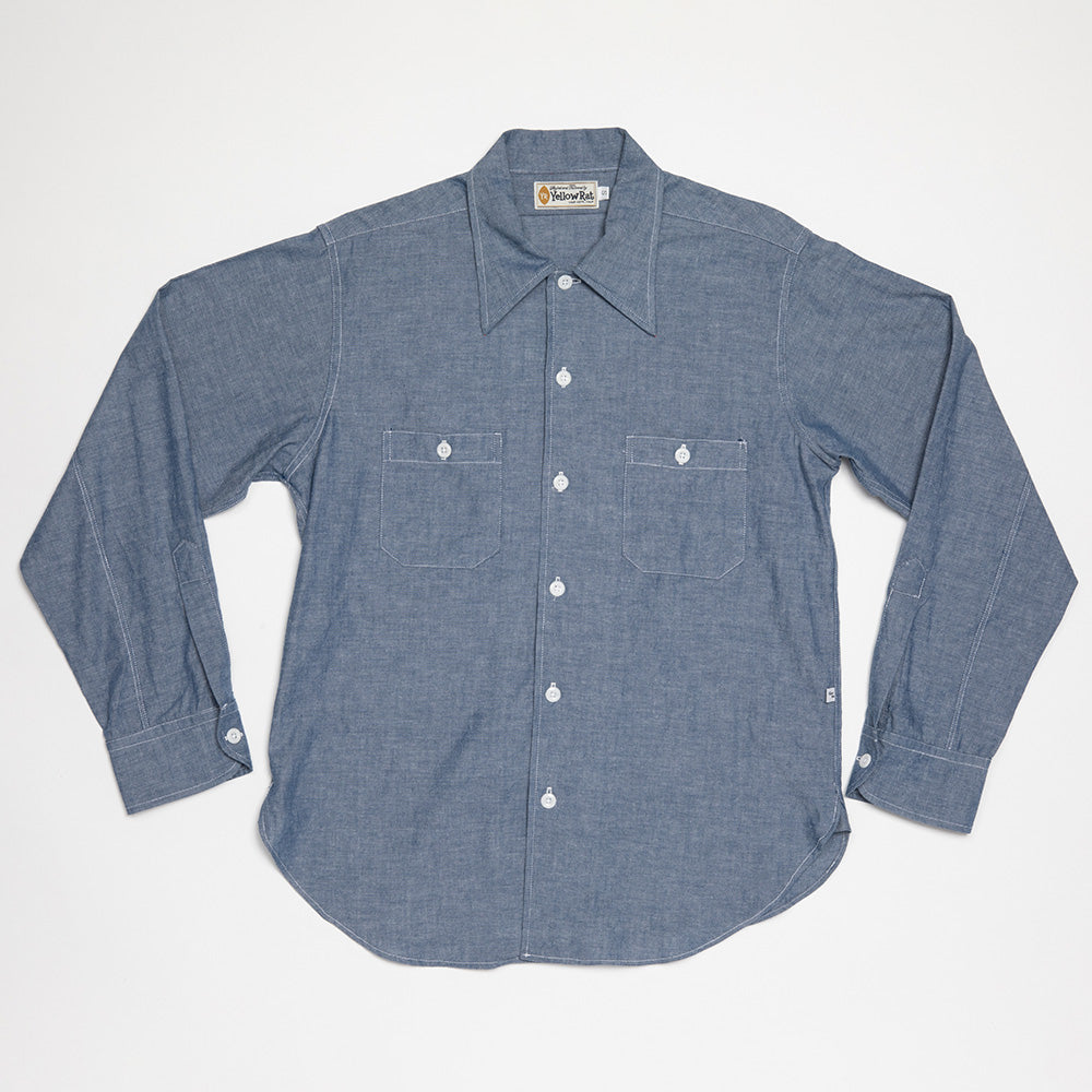 Open collar work shirt made of 100% cotton chambray. Plain style from the work shirts in the 40s with open collar and simple double front pockets, Ordinary casual is the concept behind this 40's work shirts. French seam is used for construction, Gusset are used at both side seam.