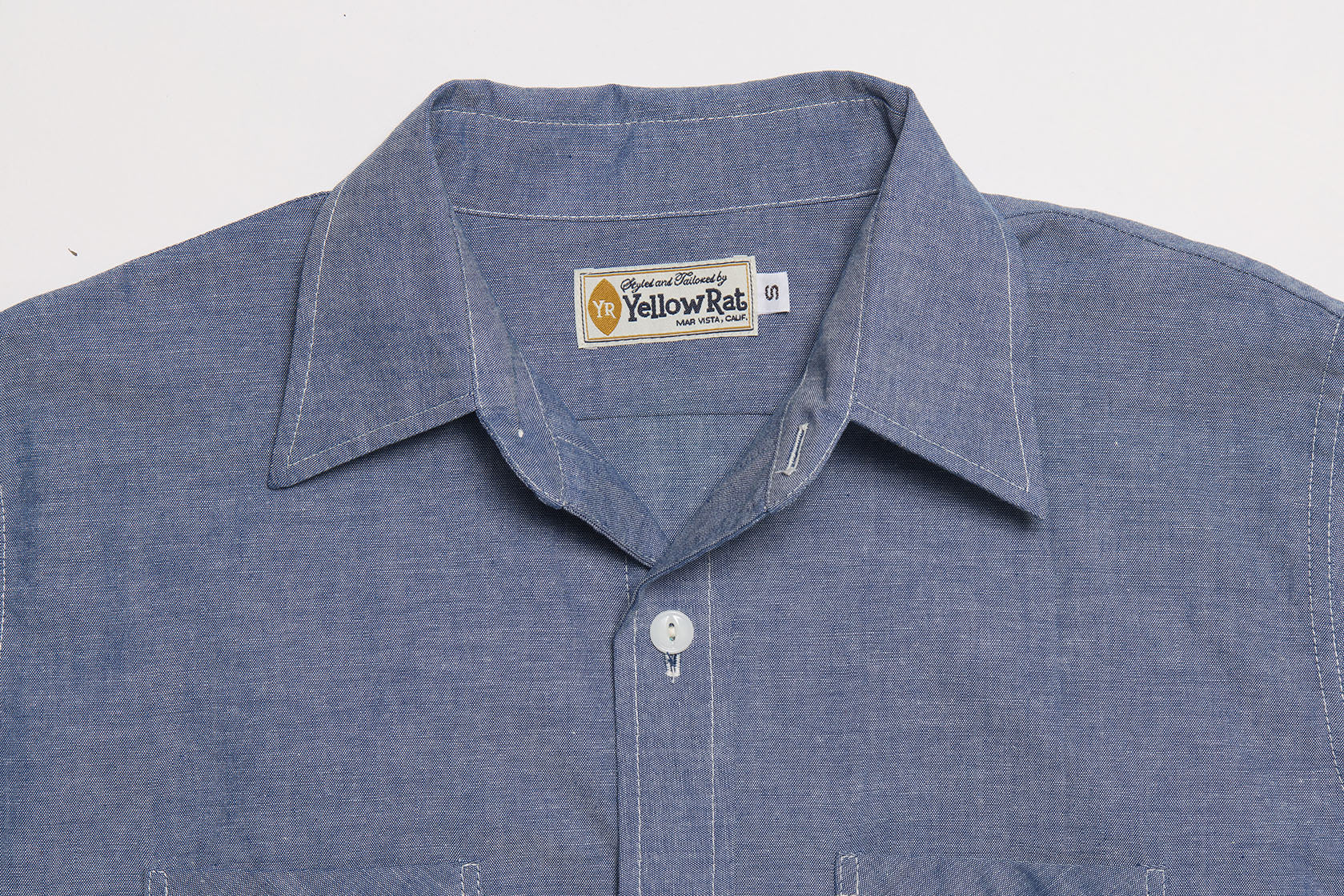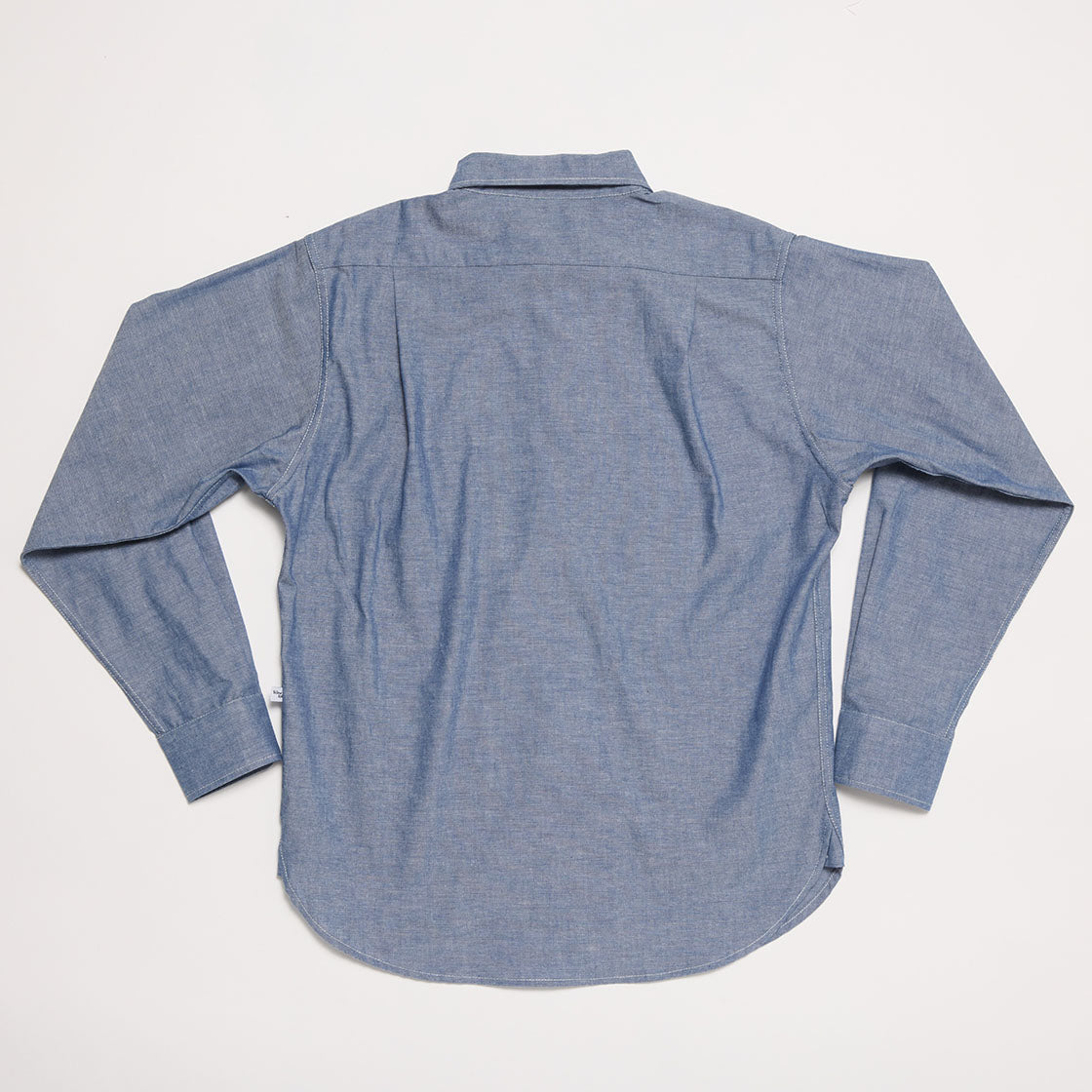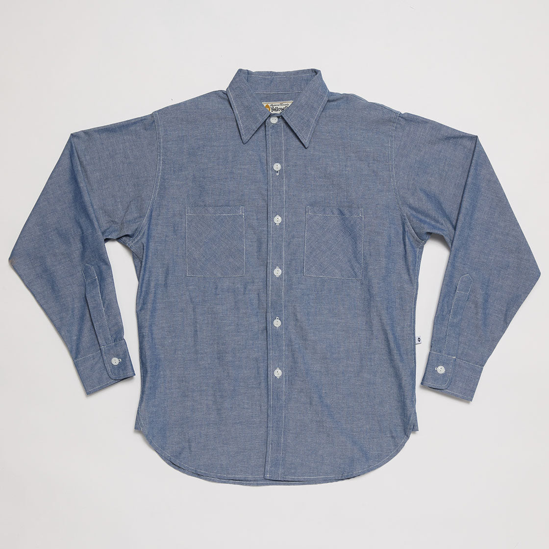 Regular collar work shirt made of 100% cotton chambray. Plain style from the work shirts in the 50s with regular collar and simple double front pockets. Ordinary casual is the concept behind this 50s work shirts. French seam is used for construction. Gusset are used at both side seam.