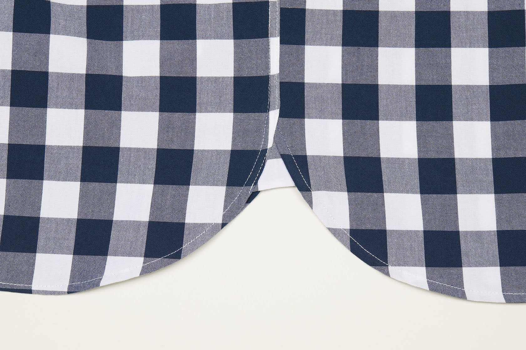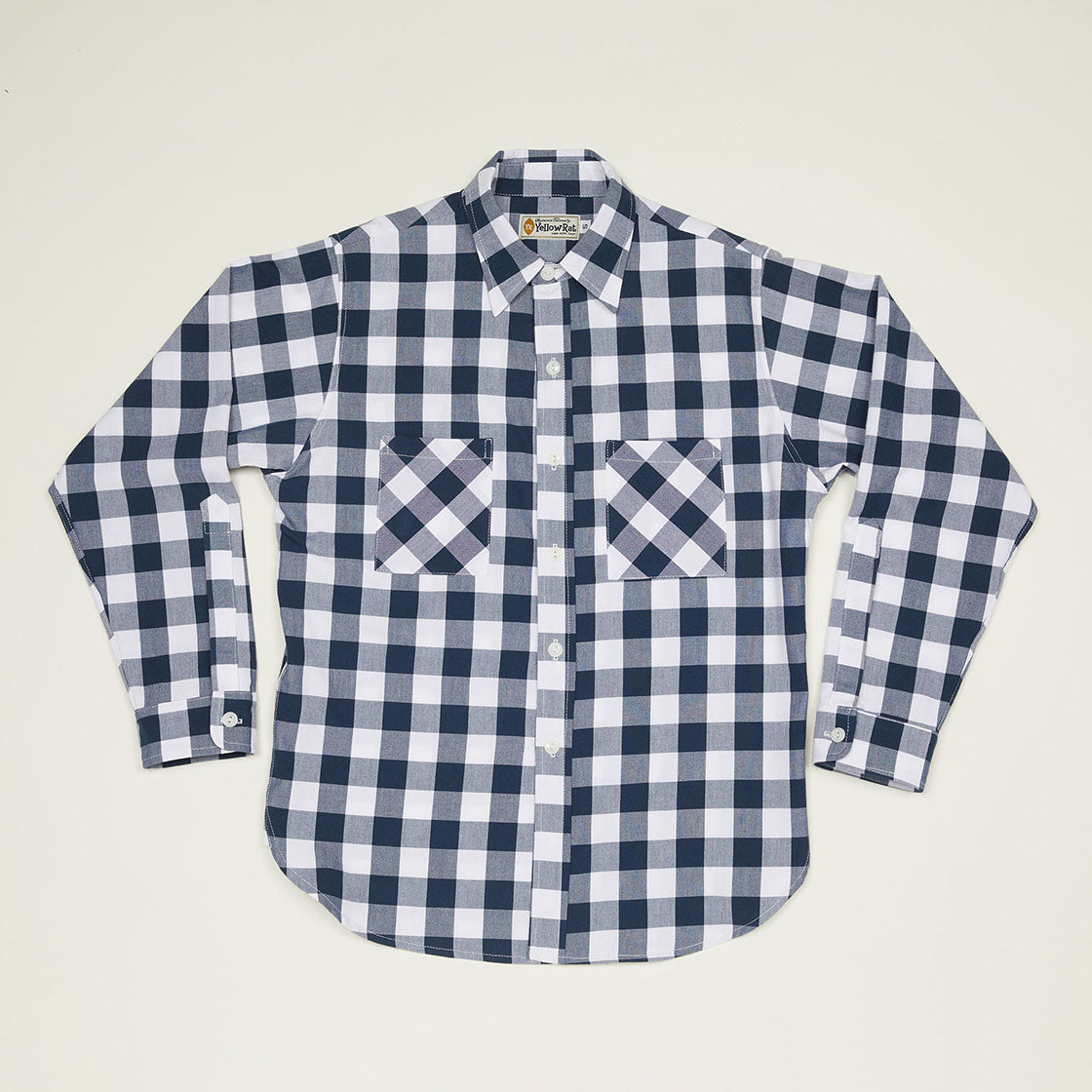 Regular collar work shirt made of 100% cotton yarn dyed plaid. Plain style from the work shirts in the 50s with regular collar and simple double front pockets. Ordinary casual is the concept behind this 50s work shirts. French seam is used for construction. Gusset are used at both side seam.