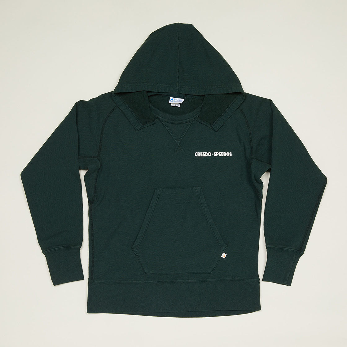 10oz hooded crew neck sweatshirt made in the U.S.A. Slightly rough texture gives real retro feel. It's fleece with reverse stitch that resists vertical shrinkage so the length stays true to size after wash. Gussets were used at underarms and armpit, rhomboid pieces of fabric inserted into a seam to add breadth and reduce stress from tight-fitting clothing. It features flat seam. 4" rib knit bottom epolet shoulder raglan sleeves, and unique combination of crew-neck and sewed on hood are truly straight out of 40s style.