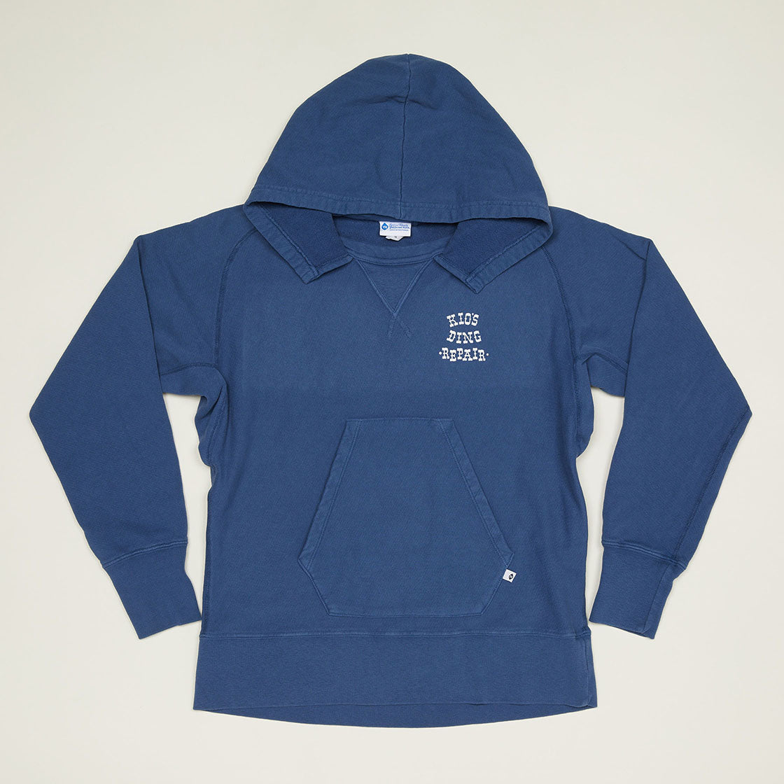 10oz hooded crew neck sweatshirt made in the U.S.A. Slightly rough texture gives real retro feel. It's fleece with reverse stitch that resists vertical shrinkage so the length stays true to size after wash. Gussets were used at underarms and armpit, rhomboid pieces of fabric inserted into a seam to add breadth and reduce stress from tight-fitting clothing. It features flat seam. 4" rib knit bottom epolet shoulder raglan sleeves, and unique combination of crew-neck and sewed on hood are truly straight out of 40s style.