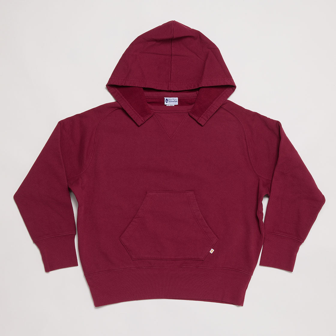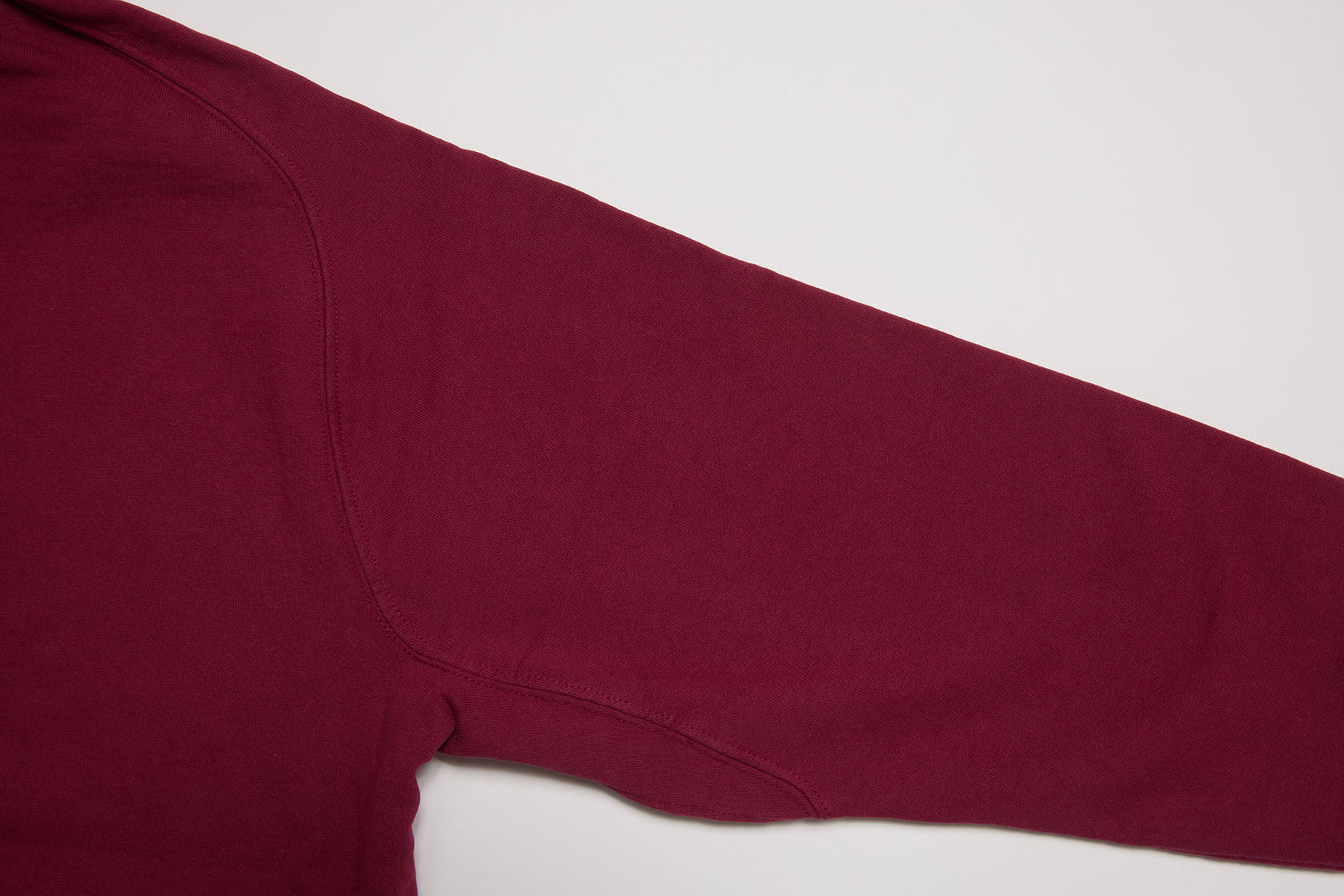 Hooded crew neck sweatshirt made in the U.S.A. Slightly rough texture gives it a real retro feel. Featuring freedom sleeves which have an S-shaped turn from the shoulder to the armpit, and the sleeves have no seams under the armpits. It was developed so that the arm can move easily, it is easy to put on and take off, and it is very comfortable to wear. But it was produced only in the 40s and 50s due to how hard it was to sew. Gussets were used at front neck, 4" rib knit bottom. Unique combination of freedom sleeves and sewed on hood.