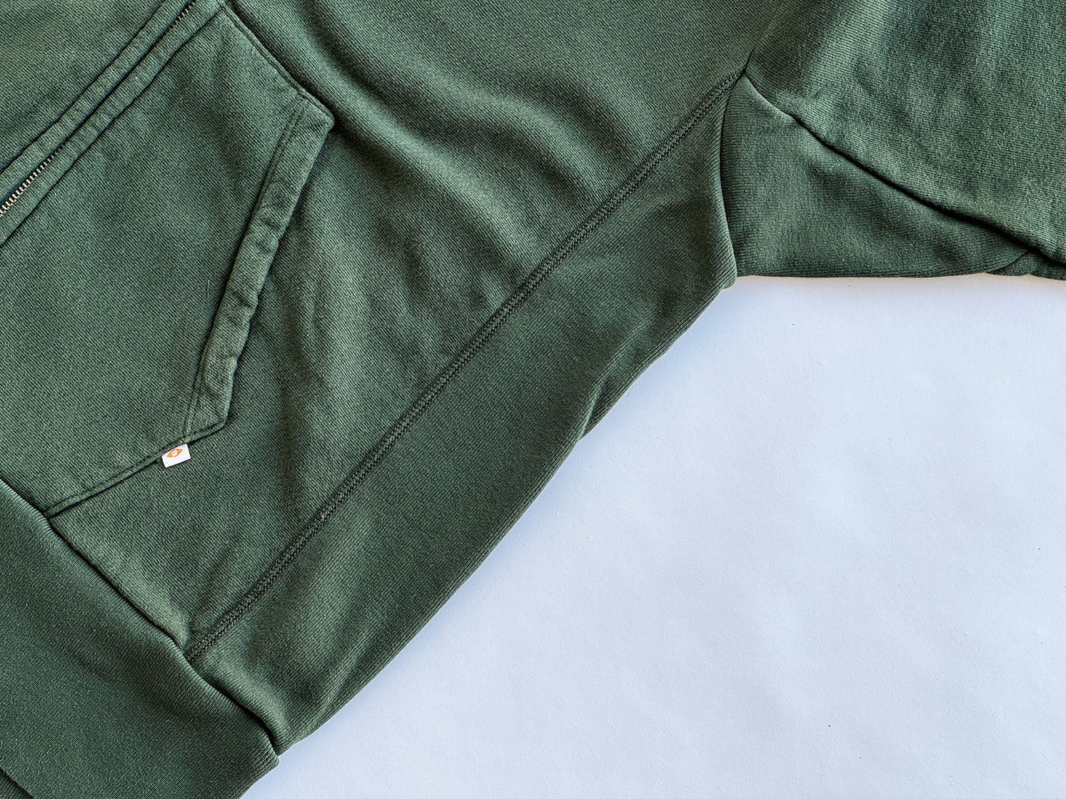 10oz hooded sweatshirt made in the U.S.A. Slightly rough texture gives real retro feel. It's fleece with reverse stitch that resists vertical shrinkage so the length stays true to size after wash. Gussets were used at underarms and armpit, rhomboid pieces of fabric inserted into a seam to add breadth and reduce stress from tight-fitting clothing. It features flat seam. 4" rib knit bottom and epolet shoulder raglan sleeves are truly straight out of late 50s–early 60s style.